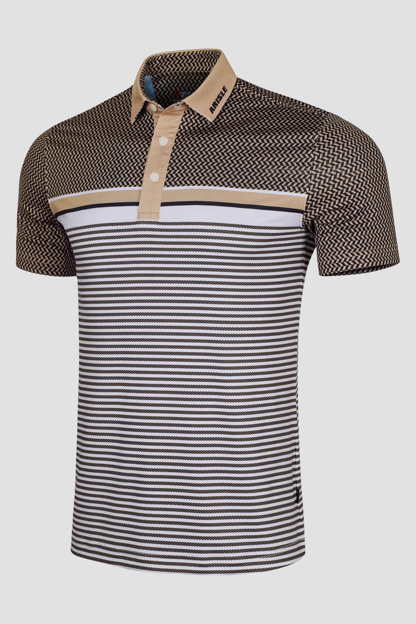 Áo Polo Golf ARISLE Royal Gold sử dụng chất liệu Stretch Jersey được dệt bằng siêu sợi ultradu đặc biệt co giãn cực tốt nhưng lại cực kỳ đanh mịn không bị nhăn nhão như các chất liệu co giãn khác, sợi vải được xử lý khử bóng (shiny) tạo nên bề mặt chất liệu mịn, lì sang trọng